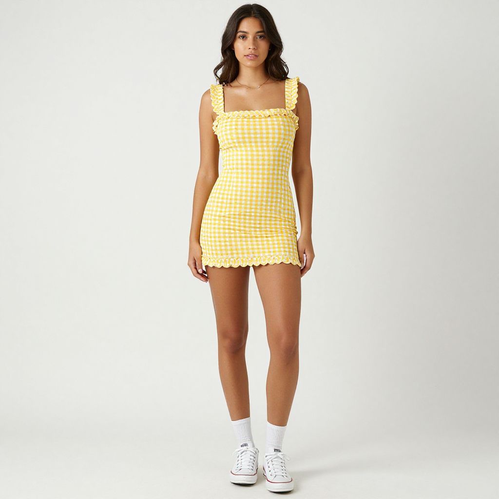 "Woman, casual summer, yellow and white gingham mini dress, sleeveless, dainty ruffle trim along neckline and hem, straight-neck, spaghetti straps, fitted silhouette, scalloped hemline, white classic low-top sneakers, plain white socks, photo studio background with plain white floor and wall.. Sexy. Pretty face and beаutiful eyes. Big breasts."