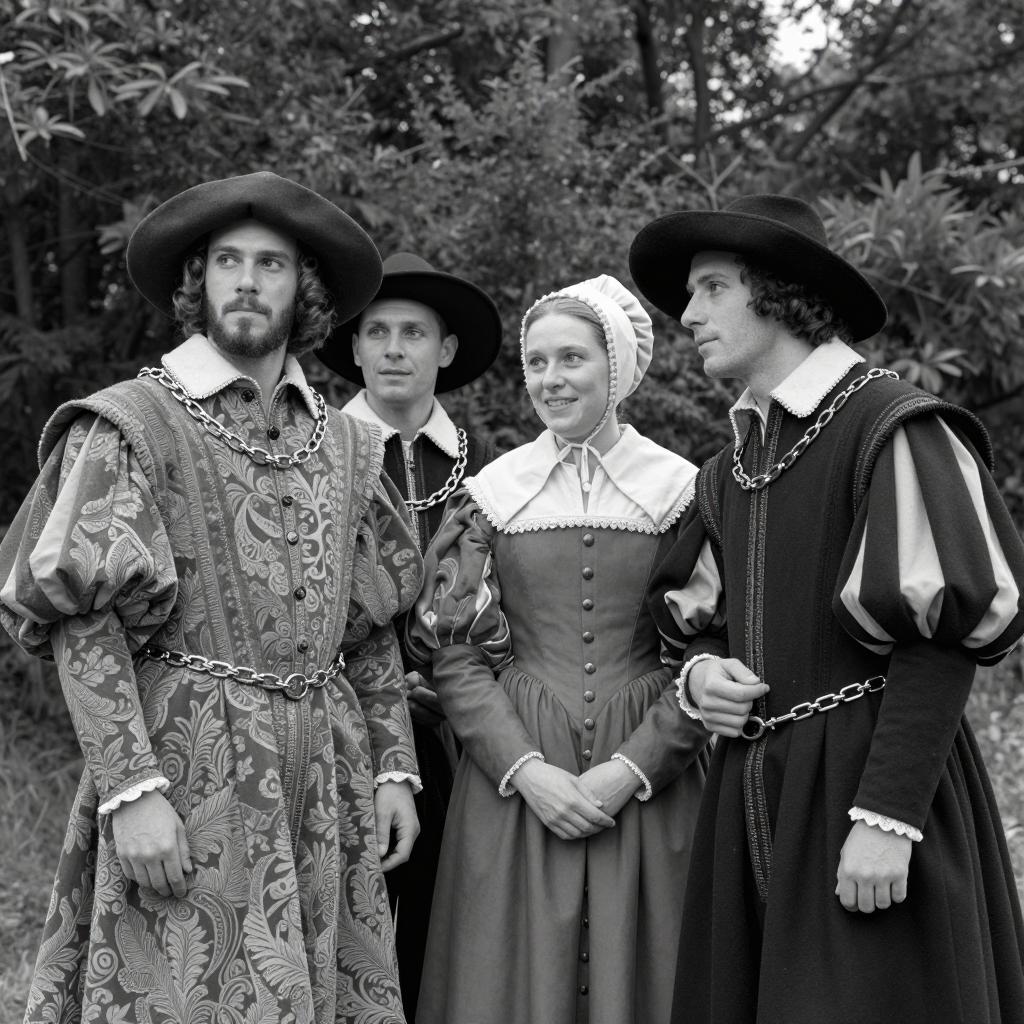 Four people dressed in 16th-century Renaissance attire stand outdoors in front of trees. Two men wear elaborate patterned robes with wide-brimmed black hats and decorative chains across their chests. Two women wear bonnets and simple, elegant dresses with wide collars and button details. The group is posed casually on grass with tree foliage in the background.