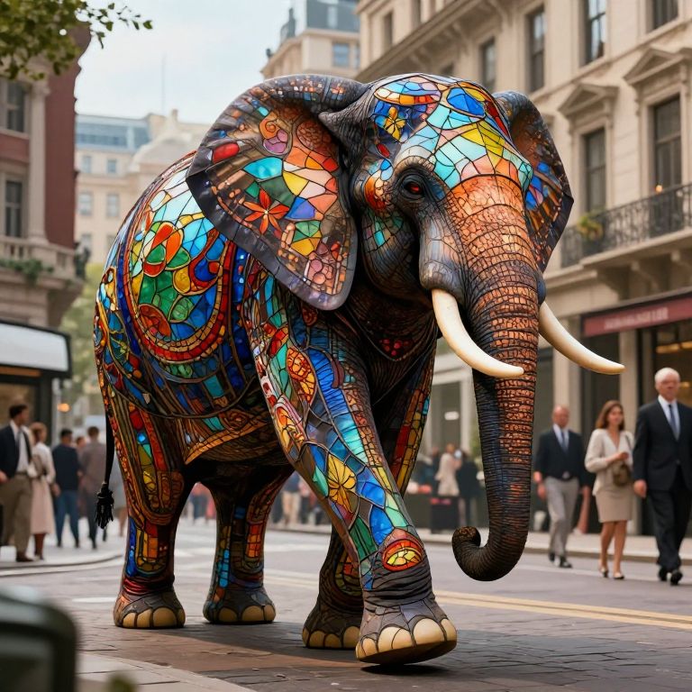 A computer-generated, high-definition illustration depicts a majestic elephant adorned with intricate stained-glass patterns, marching confidently through a bustling urban street lined with historic buildings, as pedestrians in formal attire observe its grandeur.