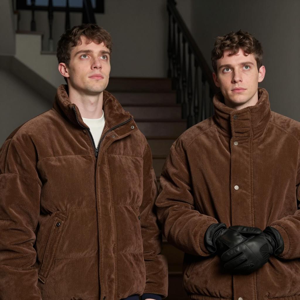 Portrait of two young light-skinned men standing on a metal industrial bridge. The taller man wears a brown leather cowboy jacket with fringe details, a black cowboy hat, and blue jeans with hands in pockets. The shorter man wears a dark brown turtleneck sweater and blue jeans, also with hands in pockets. The background features structural steel elements of the bridge under overcast sky.