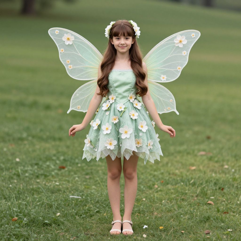 Photograph of a young girl with long brown hair, wearing a light green flower dress, white fairy wings, and flower headband, standing on a