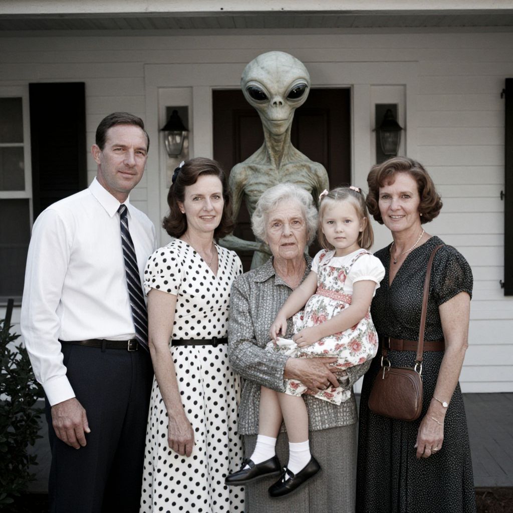 In this vintage family photo, a group of five individuals stands in front of a house, with a striking alien figure standing behind them. The man on the left wears a white shirt with a striped tie and dark pants, while the woman next to him dons a polka-dotted dress. The elderly woman in the center holds a young girl in a floral dress, and the woman on the right wears a dark dress with a purse. The alien, with its large, expressive eyes and textured skin, stands out prominently, adding a surreal element to the otherwise traditional family portrait. The house features white siding and a door, with windows and a lamp visible in the background. The overall composition is balanced, with the family members and the alien evenly distributed across the frame.