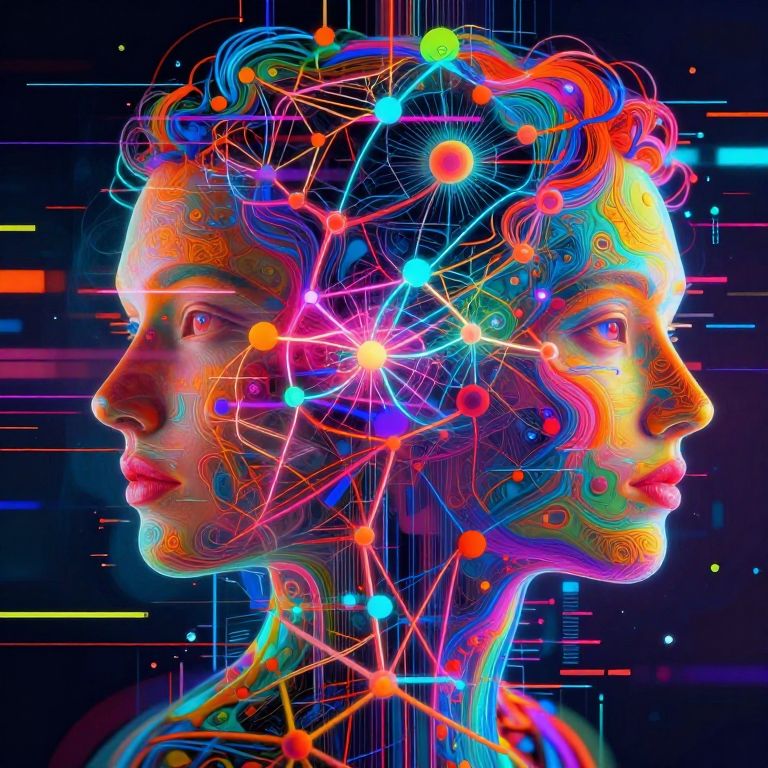 Digital artwork of a neon-lit female profile with colorful, intricate brain-like patterns and glowing lines on a dark background.