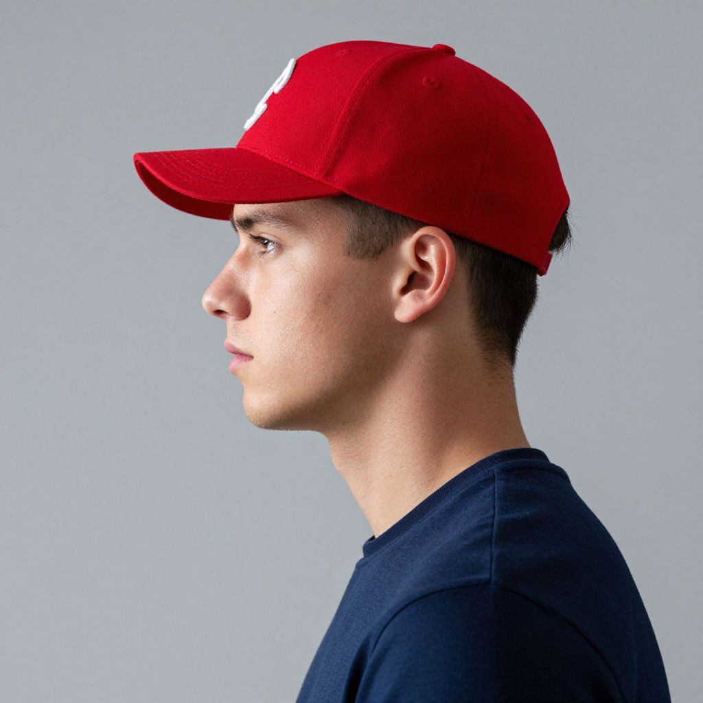 A young man wearing a red baseball cap and a blue shirt, captured in a side profile portrait with hard rim lighting.