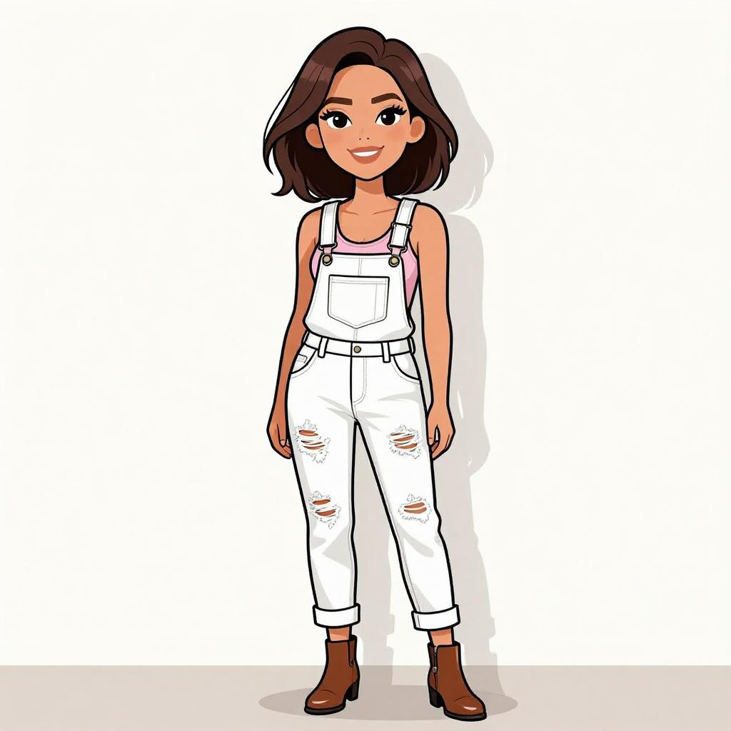 Digital illustration of a smiling young woman in blue denim overalls, white shirt, beige hat, hoop earrings, bracelets, and black boots.