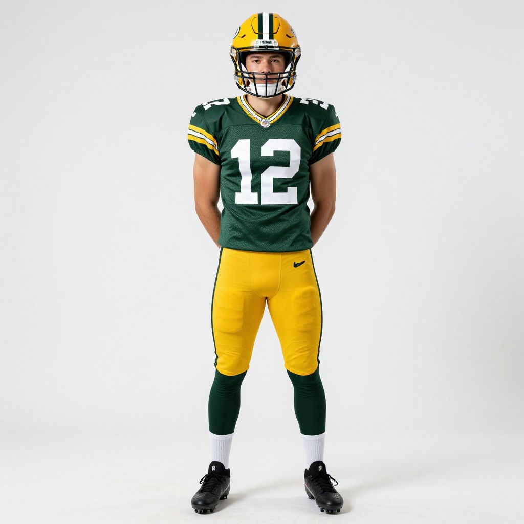 A photograph of a young man standing against a plain white background, wearing a green and yellow Green Bay Packers football jersey with the number 12, yellow pants, white socks, and black cleats. He's also sporting a yellow helmet with a face mask, and his arms are behind his back. The lighting is bright, highlighting the colors and textures of his uniform.