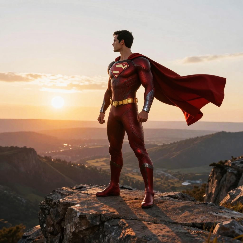 Superhero with red suit standing heroically on a rocky cliff overlooking a vast valley, dramatic sunrise casting long shadows, wind blowing the cape, intricate suit details with metallic red hues, epic fantasy style with vibrant colors and atmospheric perspective.