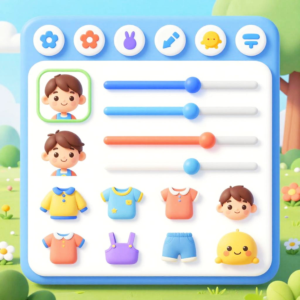 Cartoon character builder interface with colorful design elements, customizable options for head, body, clothes, and accessories, vibrant and playful style, kid-friendly art, dynamic UI layout with tool icons and sliders, bright pastel color palette, digital art
