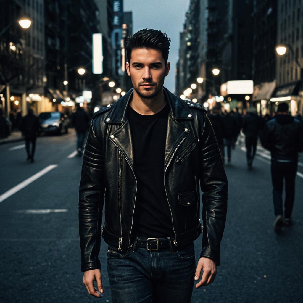 Portrait of a 28-year-old man wearing a black leather jacket and dark jeans walking down a bustling city street at dusk. The moody, dim lighting highlights his sharp features and edgy style, creating a cinematic urban atmosphere with blurred city lights in the background.