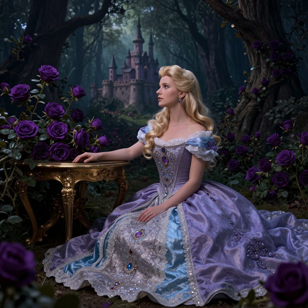The image presents a breathtaking portrait of Princess Aurora, the Sleeping Beauty, in a regal and enchanting setting. She is adorned in a luxurious, off-the-shoulder gown of soft purples and blues, embellished with intricate lace and jewels, exuding a sense of nobility and elegance. Her long, wavy blonde hair cascades down, framing her face and adding to her ethereal beauty. Princess Aurora is seated sideways, her hand gently resting on a golden table, as she gazes thoughtfully into the distance, her expression one of contemplation and planning. The background is a moody, dark, and mystical forest, filled with an endless expanse of wild, dark Briar roses, their vibrant purple hues contrasting with the deep, rich greens of the foliage. A small castle, a symbol of her kingdom, is nestled among the roses, adding a sense of grandeur and fantasy to the scene. The lighting is soft and ethereal, with a mother-of-pearl quality that enhances the dreamlike atmosphere, creating a sense of depth and dimension. The overall composition is dynamic and masterful, with a balance of elements that draw the viewer's eye across the scene, from the princess to the intricate details of her attire and the lush, vibrant roses. The image is a testament to the power of fantasy realism, capturing the essence of a fairy tale world in a highly detailed and photorealistic manner, making it a true masterpiece.