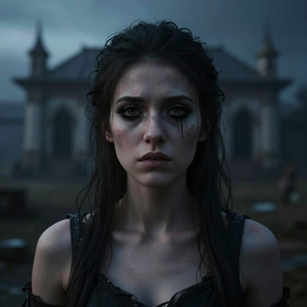 Striped Insecure (young woman:1.1), background is Delicious Monastery, at Dusk, deep focus, Graphic novel, Confused, Post-Apocalyptic, Bloom light, Depth of field 100mm, Amaro, RTX, make-up, mascara, ruined make-up, eyeshadow, (flat che BREAK 1.2), moody atmosphere, misty, night, low light, chiaroscuro, masterpiece, best quality, (intricate details), dreamy, perfect eyes, dark pupils, magnificent, ethereal, volumetric lighting, lightroom, ((cinematic)), raytracing, subsurface scattering, face focus
