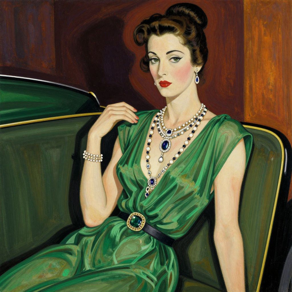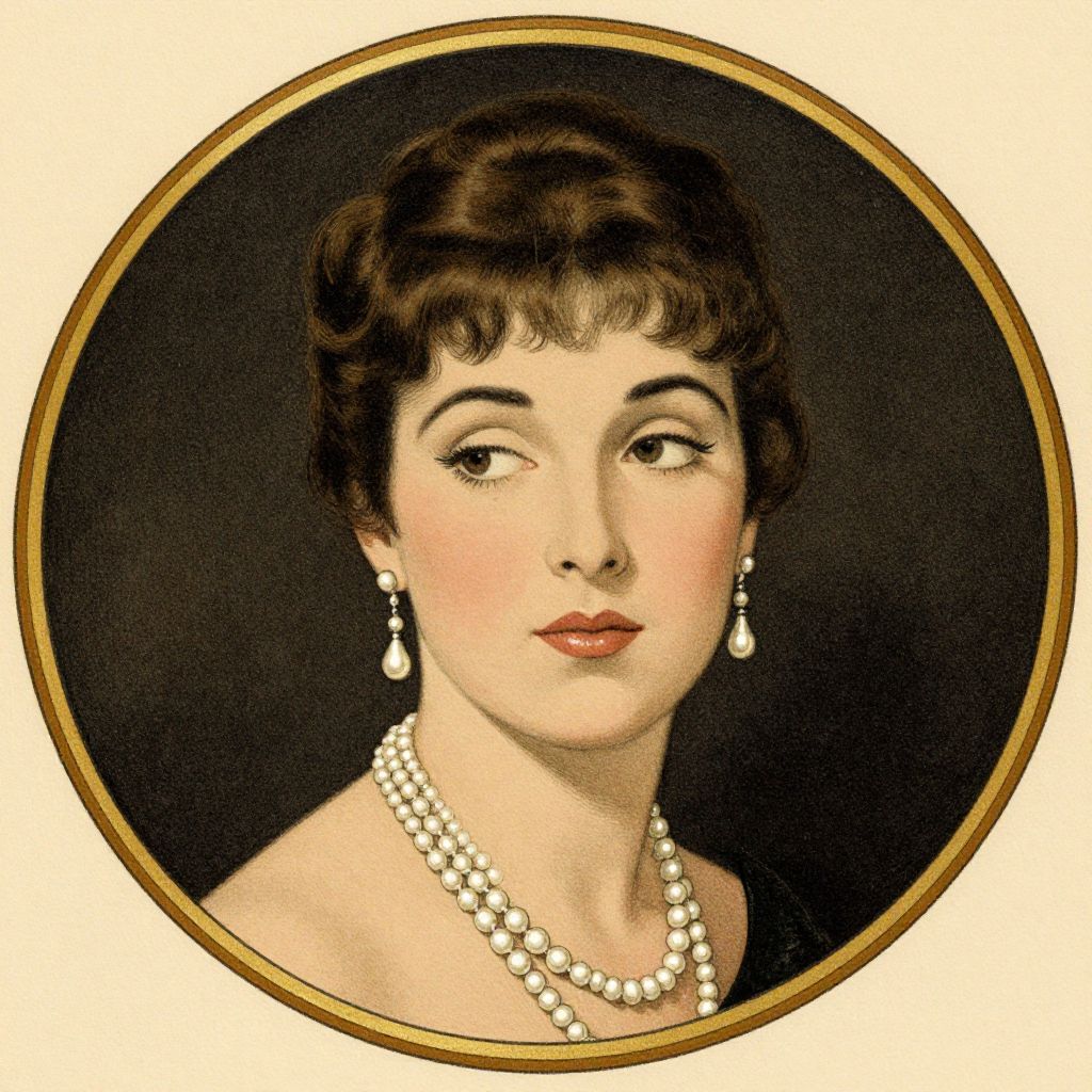 A vintage-style illustration reminiscent of Dod Procter's work from 1932-1941, featuring a woman adorned with a pearl necklace and earrings, set against a dark circular background with a warm, golden-toned border, evoking a classic and elegant aesthetic.