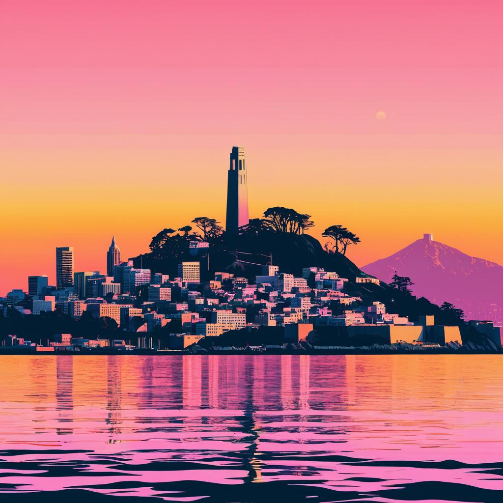 Savanna African wildlife scene with elephants, giraffes, and acacia trees, depicted in a minimalist vector illustration with earthy sunset hues and sticker aesthetic. Minimalist skyline style with reflections in water, pop color palette, sticker aesthetic