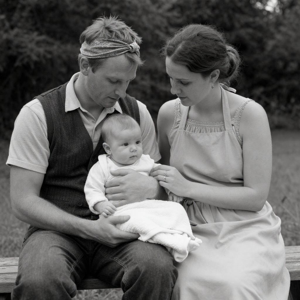 Black-and-white photograph of a man and woman sitting outdoors, holding a baby. The man, wearing a headband, vest, and shirt, sits to the left, while the woman, in a dress and apron, sits to the right. Both look at the baby, who is wrapped in a blanket. Trees and grass are in the background.
