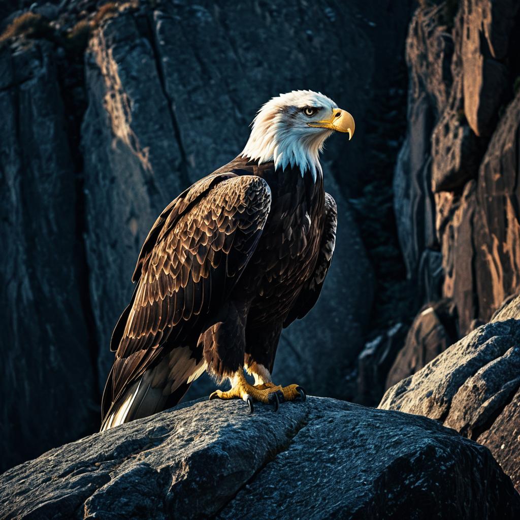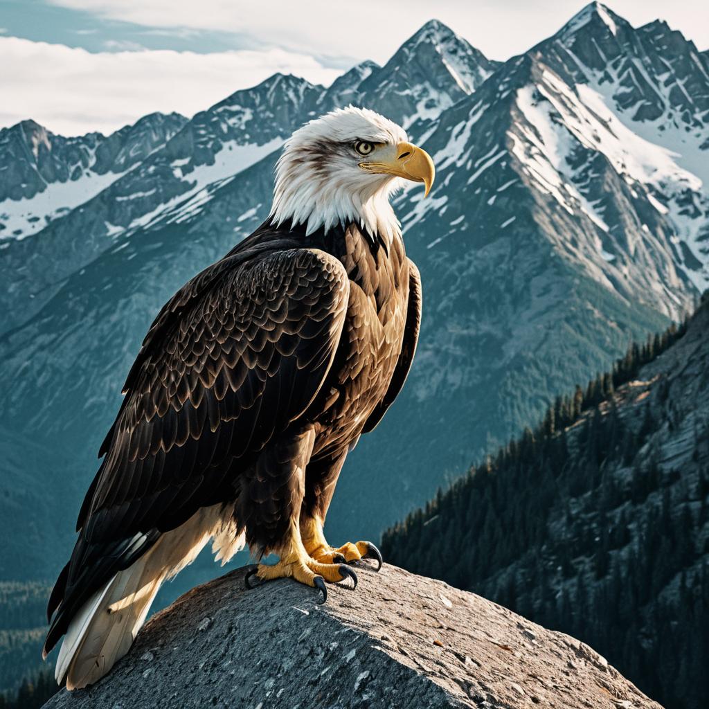 A high-quality illustration of a majestic eagle at rest, its regal plumage and vigilant eyes set against a crisp mountain peak environment. The image conveys an aura of power, serenity, and noble grandeur.