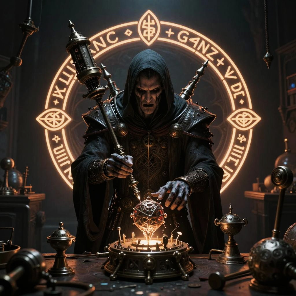 Villian creator concept art, a dark and mysterious figure surrounded by arcane machinery and glowing runes, crafting sinister inventions in a dimly lit workshop, gothic atmosphere, intricate details, sharp contrasts, cinematic lighting
