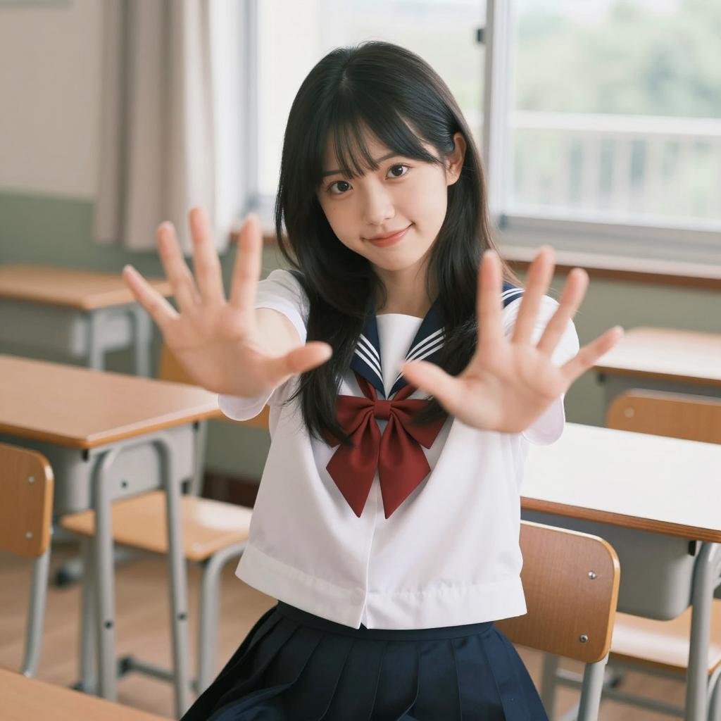 Asian woman with long black hair, wearing a Japanese schoolgirl uniform with a white top, blue skirt, and red bow, sitting in a classroom. She extends both hands forward with fingers spread. Background includes wooden desks and a window. Soft, natural light. Gentle smile. Photographer's "CGE-JAPAN" on the right.