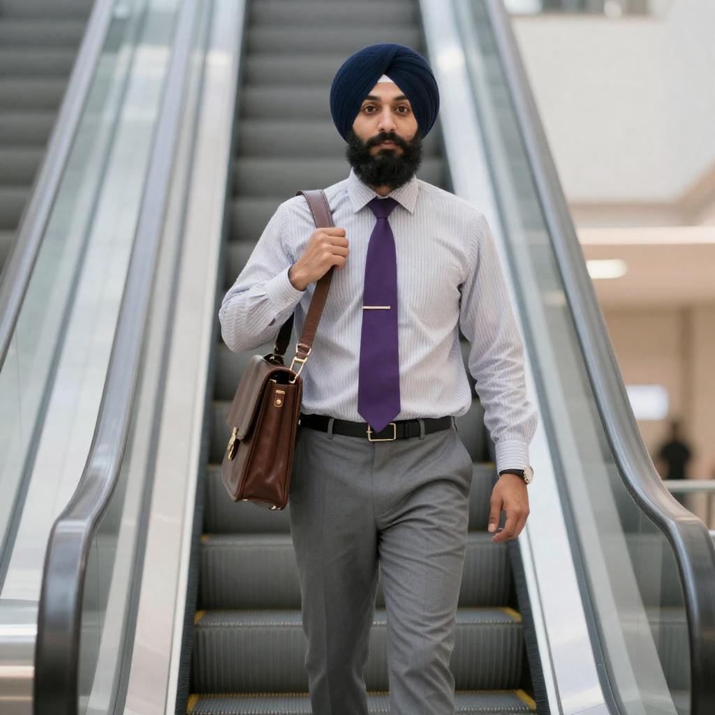 Man with purple turban, white striped shirt, blue tie, gray pants, brown satchel, running to the right. Bearded, focused expression. Modern beige building with rectangular panels in background. Mid-motion, arm extended, leg forward. Daylight, outdoor setting.