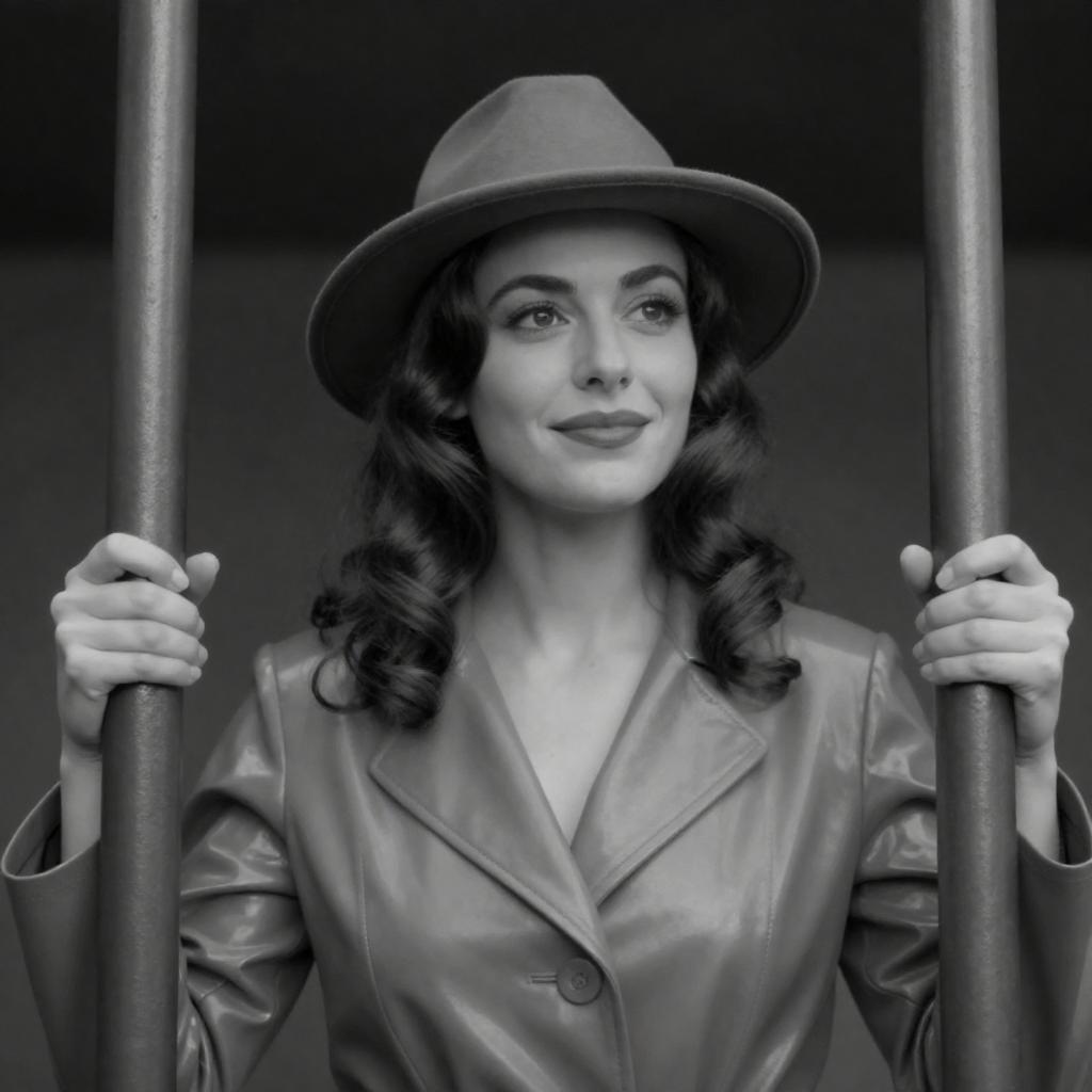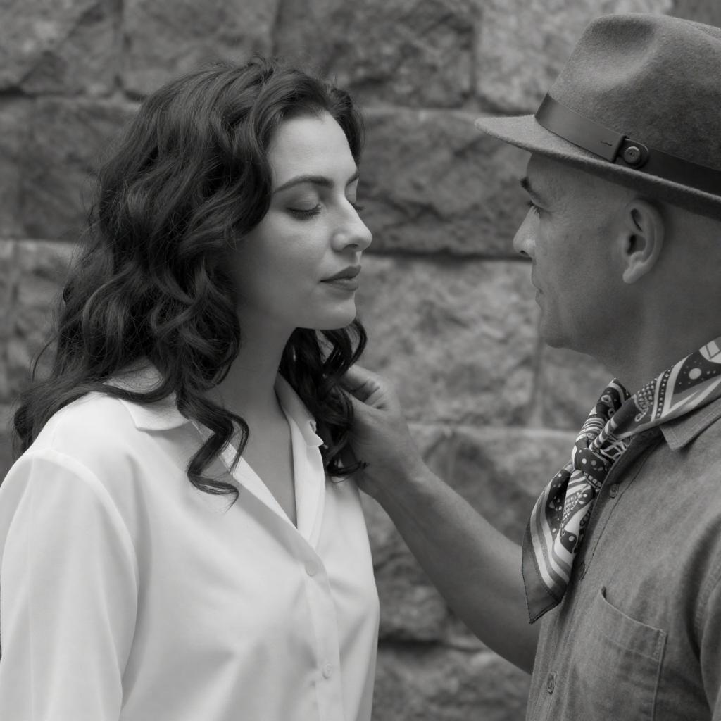 Black and white photograph of a man and woman. Woman with dark, wavy hair, closed eyes, and white blouse, slightly leaning forward. Man with bald head, wearing hat, shirt, and patterned scarf, looking at her. Stone wall background.
