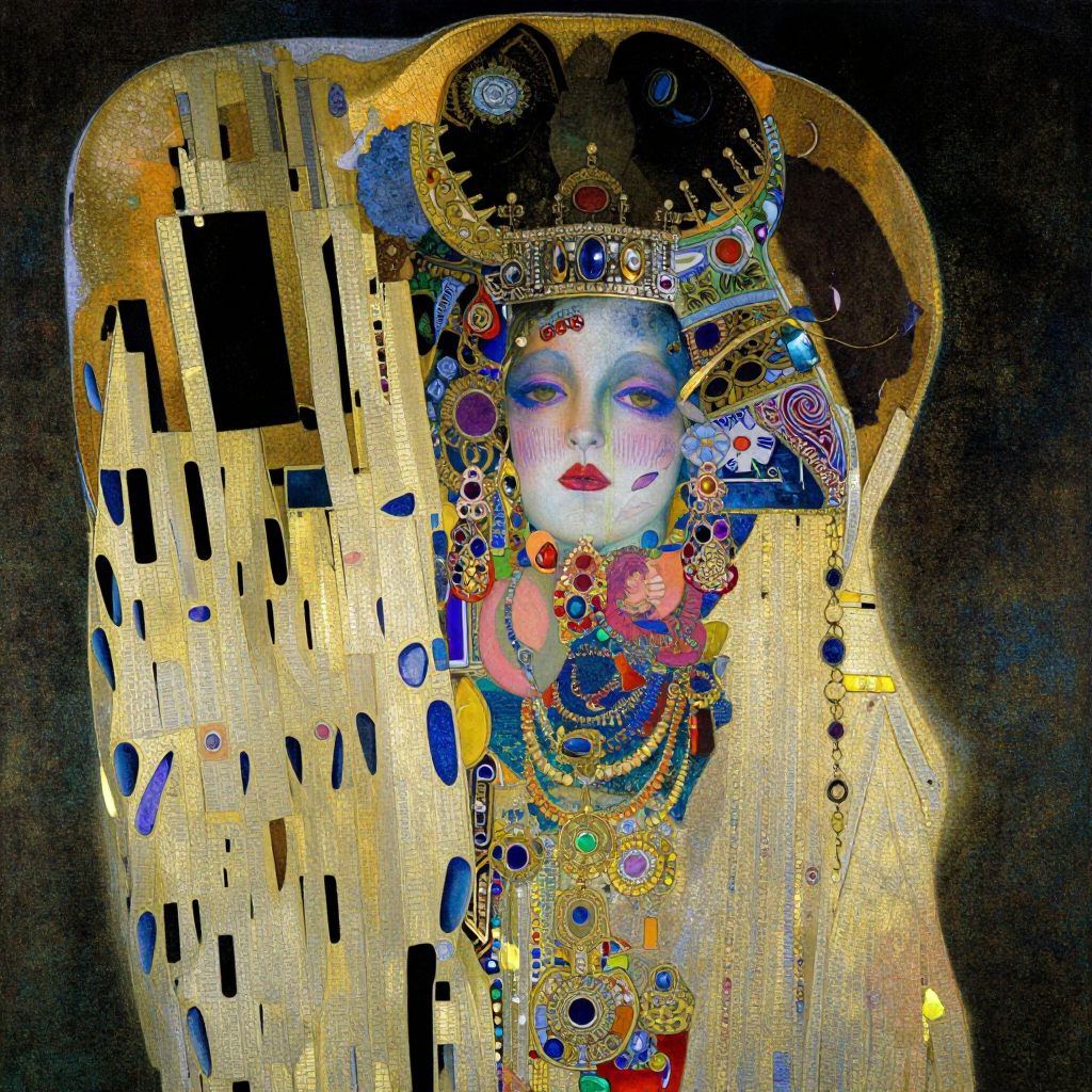 The image depicts a highly detailed and ornate figure, likely a woman, adorned in an elaborate and fantastical costume reminiscent of Gustav Klimt and Zdzisław Beksinski's styles. The figure's head is adorned with a grand, intricate crown featuring gold accents, gemstones, and intricate patterns that cascade down the sides. The crown is complemented by a series of dangling earrings and a necklace that matches the crown's opulence. The figure's face is painted with a blend of blue and white hues, with delicate lines and patterns that add to the ethereal quality of the image. The background is dark, which contrasts sharply with the vibrant colors and intricate details of the costume, making the figure the focal point of the composition. The overall arrangement of the elements suggests a sense of depth and dimension, with the crown and necklace appearing to be in front of the figure, while the earrings dangle from the sides of the head. The interplay of colors, textures, and shapes creates a visually striking and dynamic image.