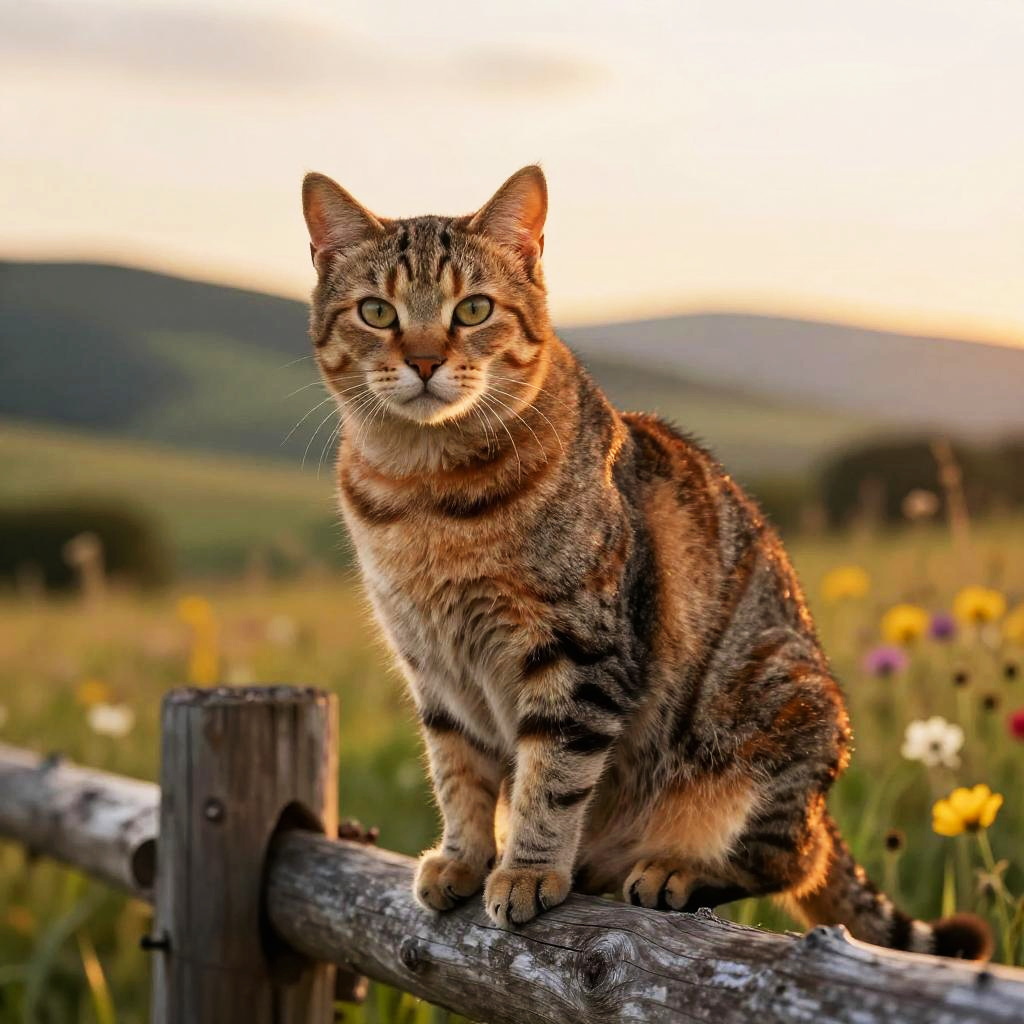A majestic orange and gray tabby cat perched on a rustic fence during golden hour, detailed fur with subtle highlights, dreamy background of rolling hills and wildflowers