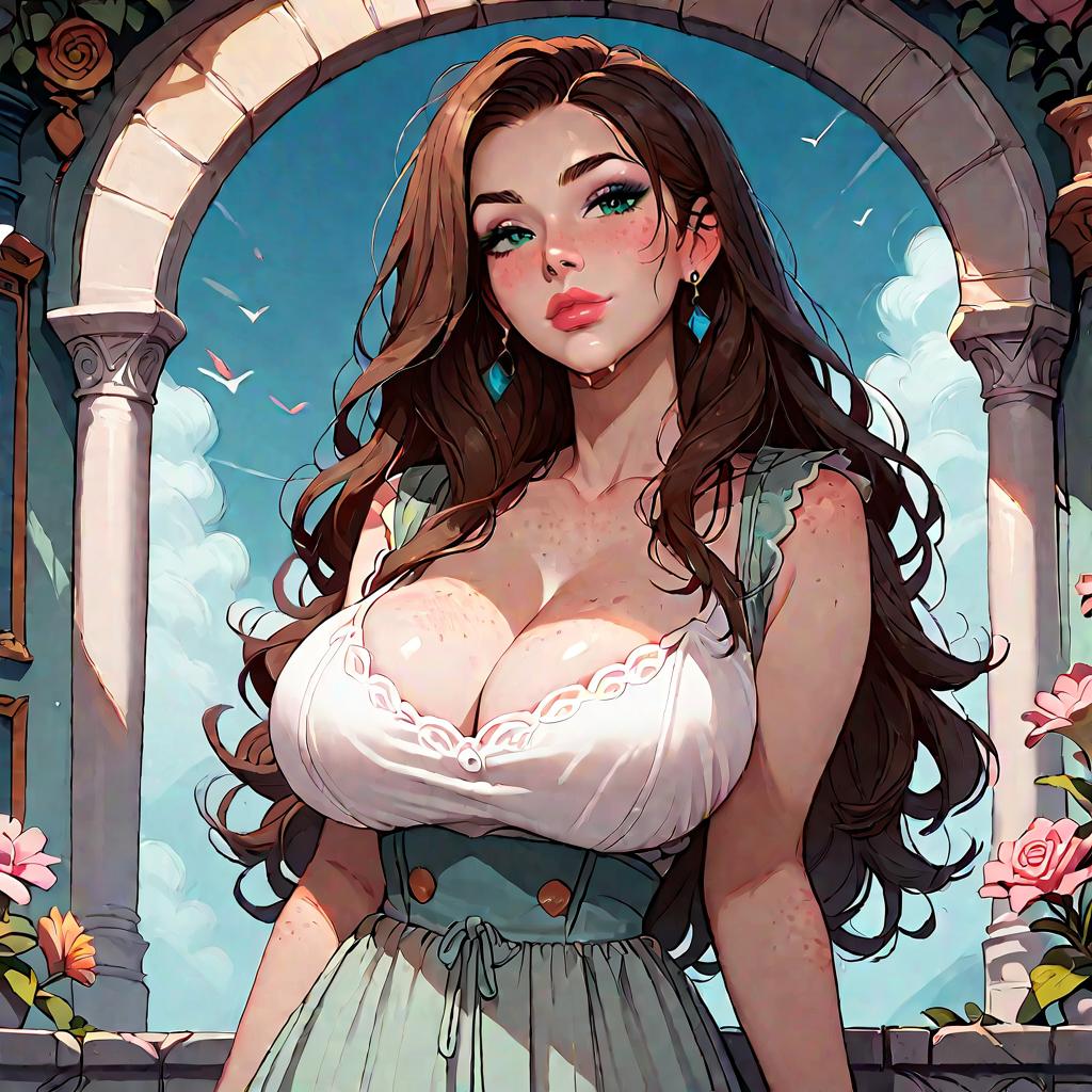 Digital anime-style drawing of a blue-haired woman with large breasts, wearing a low-cut white kimono, leaning forward in a sunlit, flower-filled
