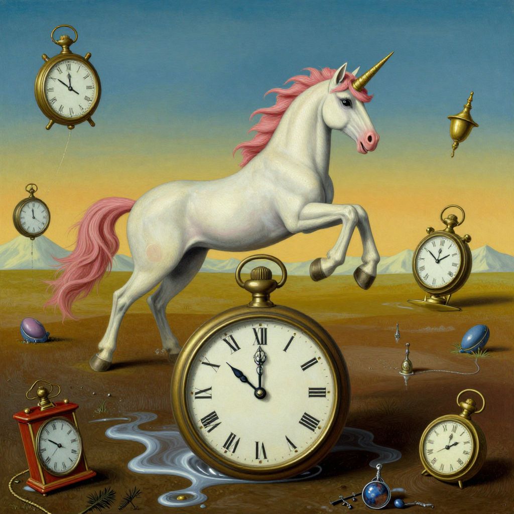 Digital illustration depicting a white unicorn with a pink mane and tail, standing on its hind legs in a surreal landscape. The unicorn has a golden horn and is surrounded by floating, antique-style clocks with black Roman numerals. Clocks are of various sizes, some tilted, with one clock lying on the ground, its hands pointing to 10:10. The background features a gradient sky from yellow to blue, with distant mountains. Clocks and the unicorn are set on a brown, textured ground. A winding blue ribbon is beneath one clock, and two eggs and a small golden pendulum are scattered around. The style is whimsical and surreal.