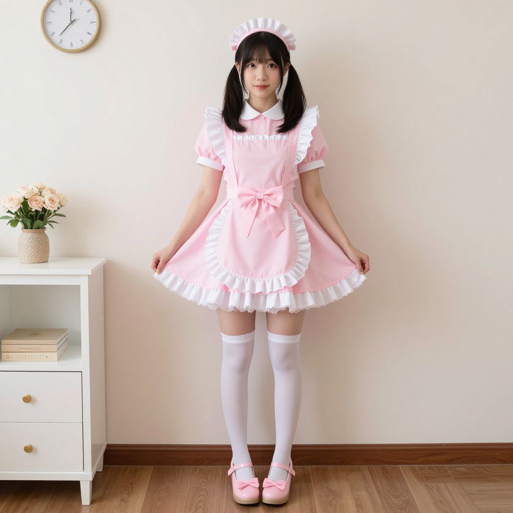 Pink Maid Outfit Costume, dressed in a pink dress and pink shoes standing in a room
