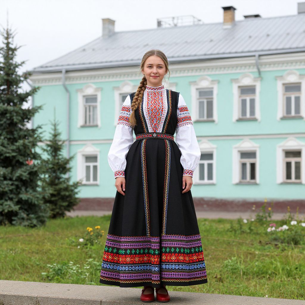 Russian Costume Female, woman in traditional dress standing in front of a building