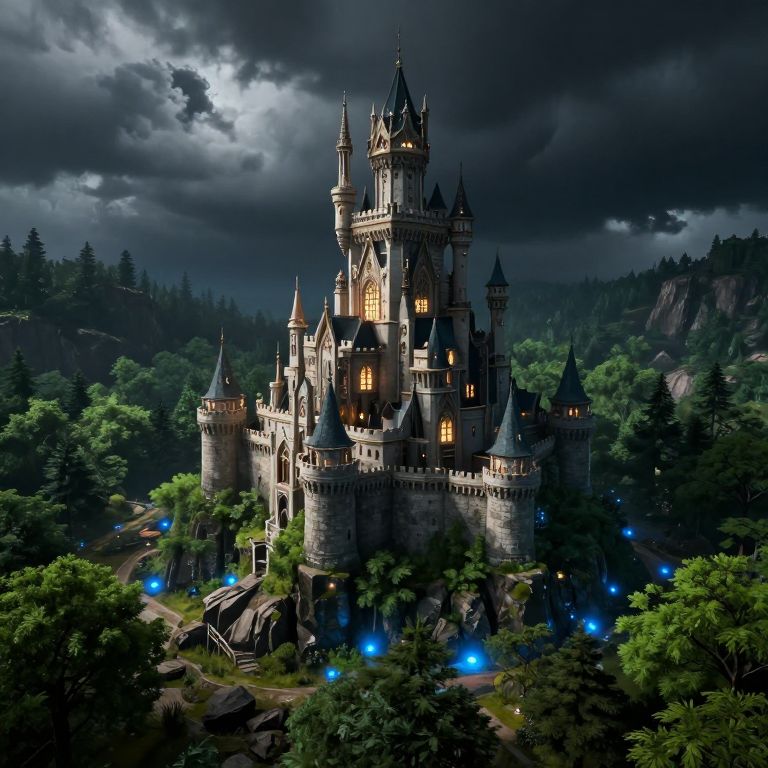 Photorealistic digital artwork of a glowing, medieval castle with blue lights surrounded by dark, stormy sky, lush green forest, and rocky terrain.
