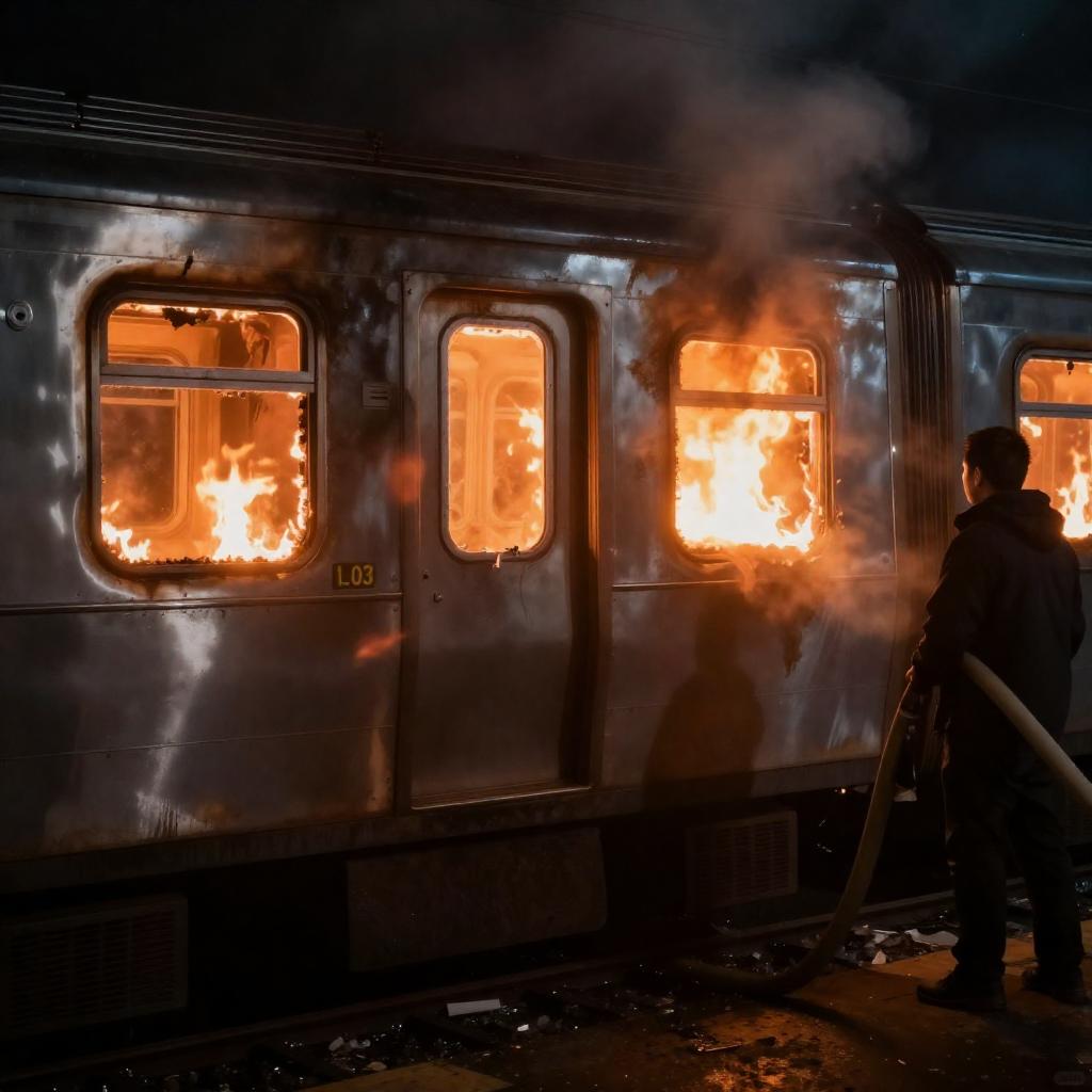 Photograph of a burning subway train at night. The train's metal exterior is charred and glowing with orange flames through the windows. A person in dark clothing stands to the right, partially illuminated by the fire, holding a hose. The ground is covered in debris and smoke.