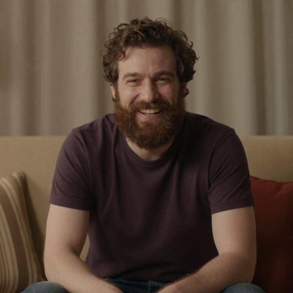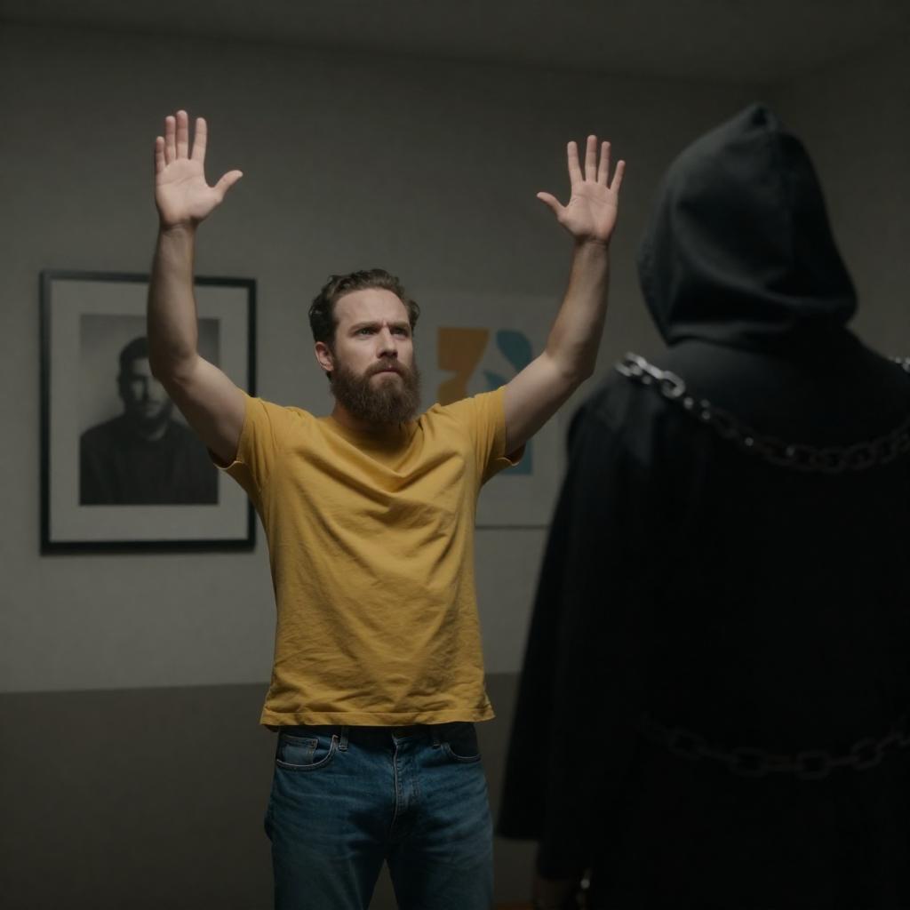 A photograph of a dimly lit room shows a bearded man in a yellow shirt and blue jeans, standing with arms raised, facing a shadowy figure in a hooded robe with chains. The background includes a framed picture and abstract wall art. The man's expression is tense, and the shadowy figure's face is obscured.