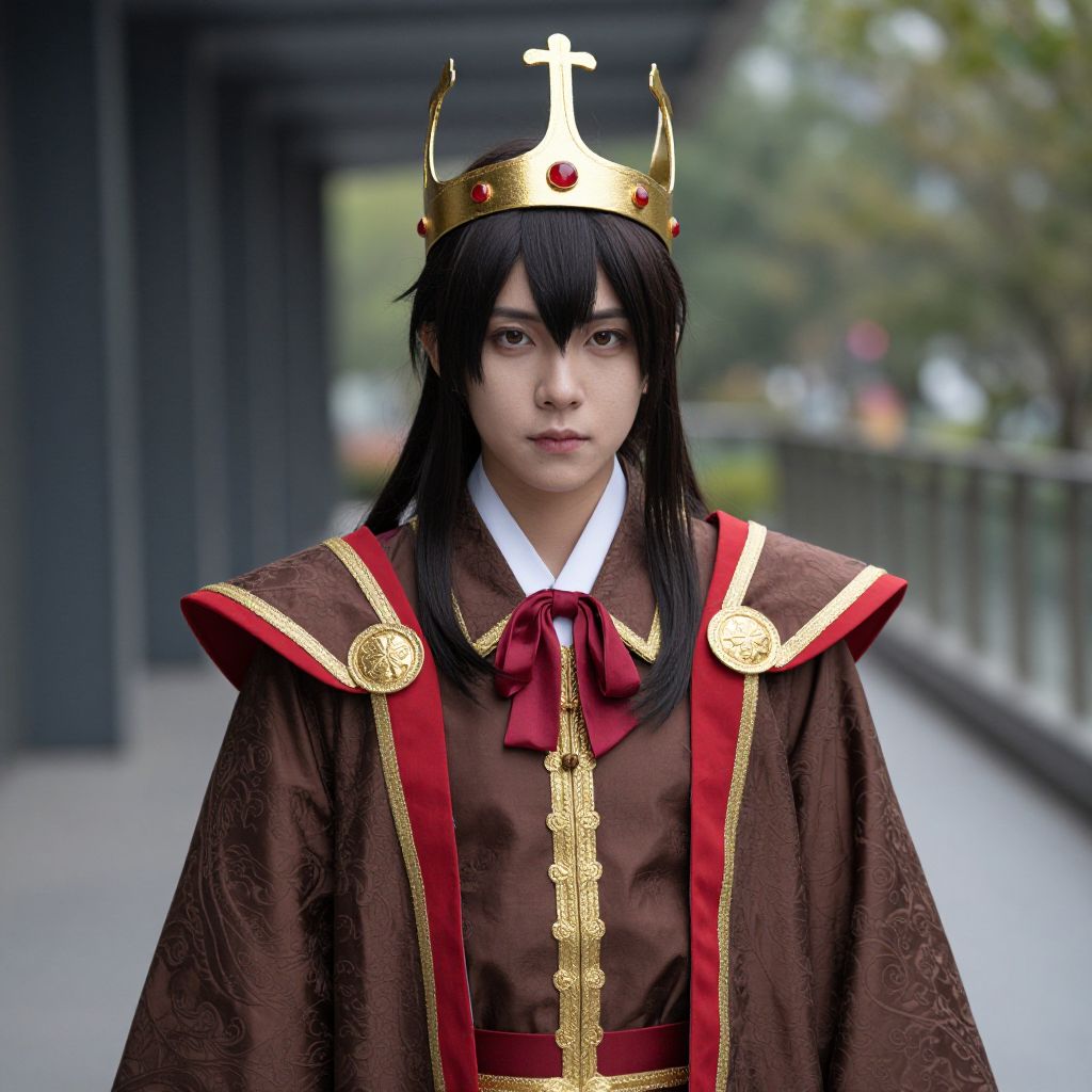 Photograph of an Asian woman cosplaying as a regal character. She has long black hair, pale skin, and wears a golden crown with a red gem and cross. Her outfit includes a brown, ornately patterned robe with red and gold trim, a white collared shirt, and a large red bow. She stands in an urban setting with blurred greenery and a bridge in the background, looking directly at the camera with a neutral expression. The lighting is natural, and the overall color palette is rich with reds, golds, and browns. The cosplay is detailed and elaborate.