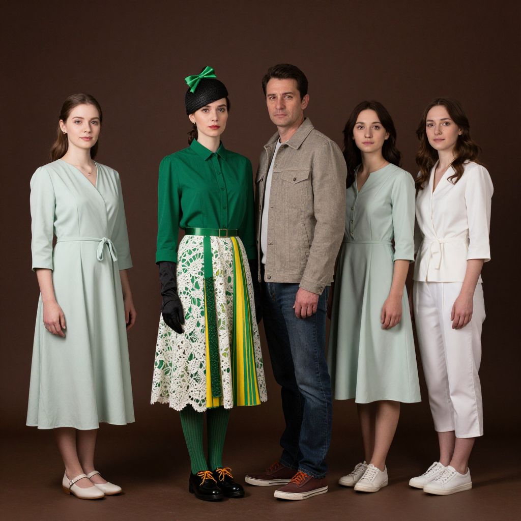A group of four individuals standing in a dark brown background: a female, a male, and two females. The female is wearing a green outfit featuring a white lace skirt with a green and yellow striped pattern, black gloves, and green striped socks. She wears a black hat adorned with a green ribbon at the top. Her shoes are black with orange laces. The male stands beside her, dressed in a neutral-toned jacket and jeans. The other two females are dressed in simple, coordinated outfits—both in light green and white, with matching accessories. The overall scene is softly lit, with the dark brown background creating a moody, elegant atmosphere. The green and yellow elements pop against the deep tones, adding a vibrant contrast to the setting.