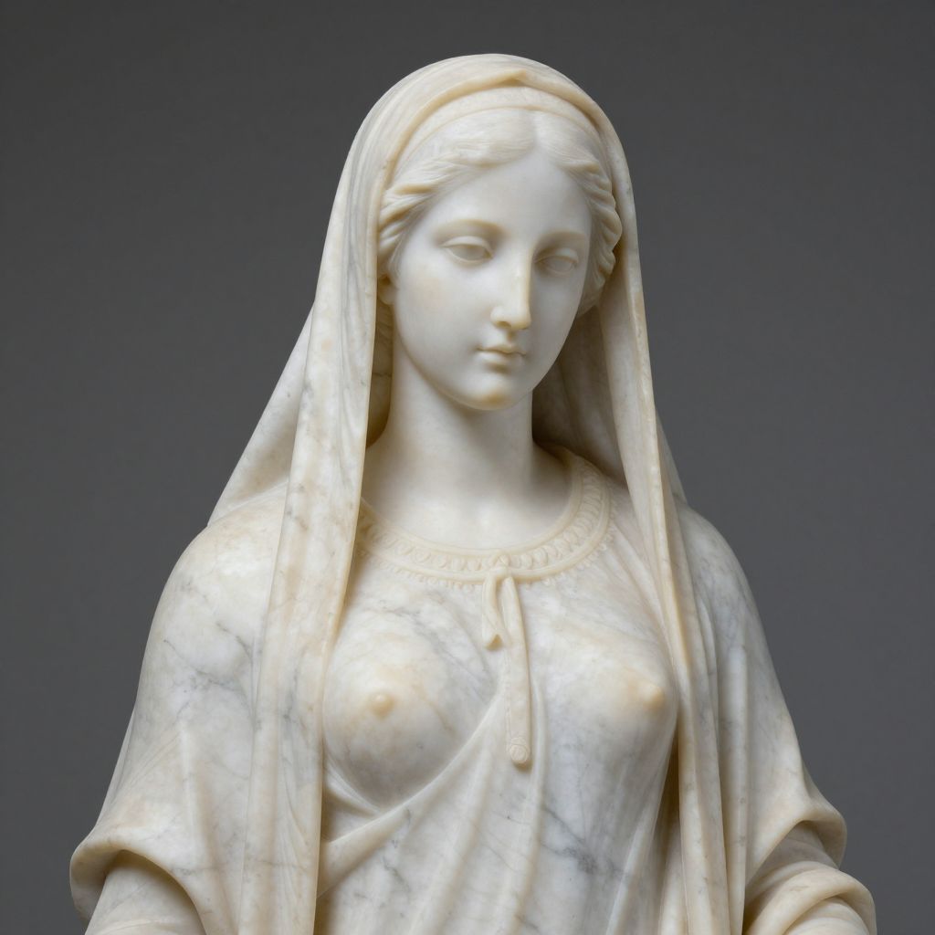 Photograph of a marble statue of a serene, young woman with a gentle expression, wearing a draped veil and modest dress, against a dark gray background