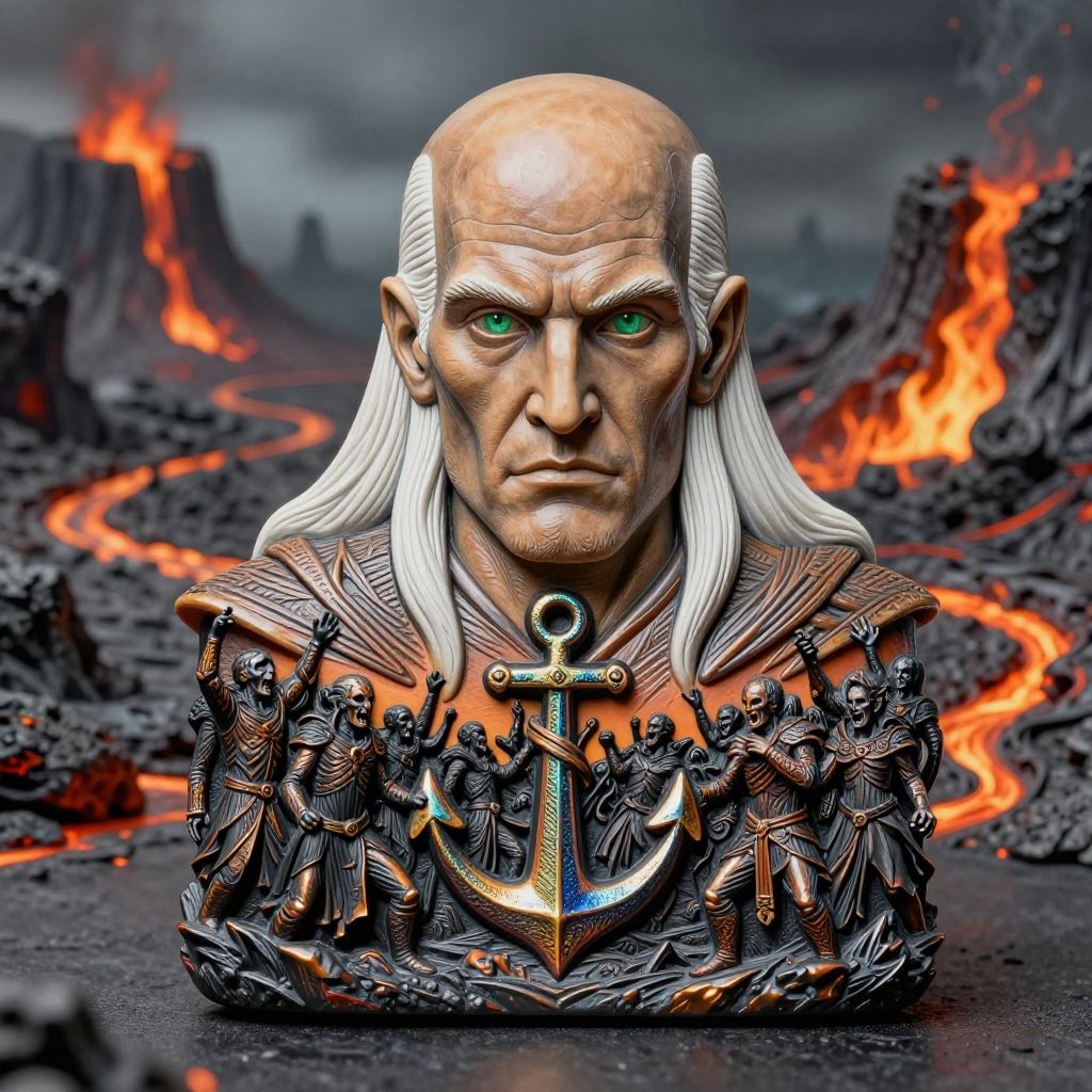 This is a highly detailed digital artwork depicting a bald, stern-looking man with piercing green eyes and long, white, flowing hair. He wears an elaborate, metallic armor adorned with intricate carvings of small, humanoid figures and an anchor emblem at the center. The background features a dramatic, apocalyptic landscape with dark, rocky terrain and vibrant, orange lava flows winding through. The sky is dark and cloudy, enhancing the ominous atmosphere. The man's expression is intense, and the overall color palette includes dark grays, blacks, and fiery oranges. The style is hyper-realistic with a fantasy theme.