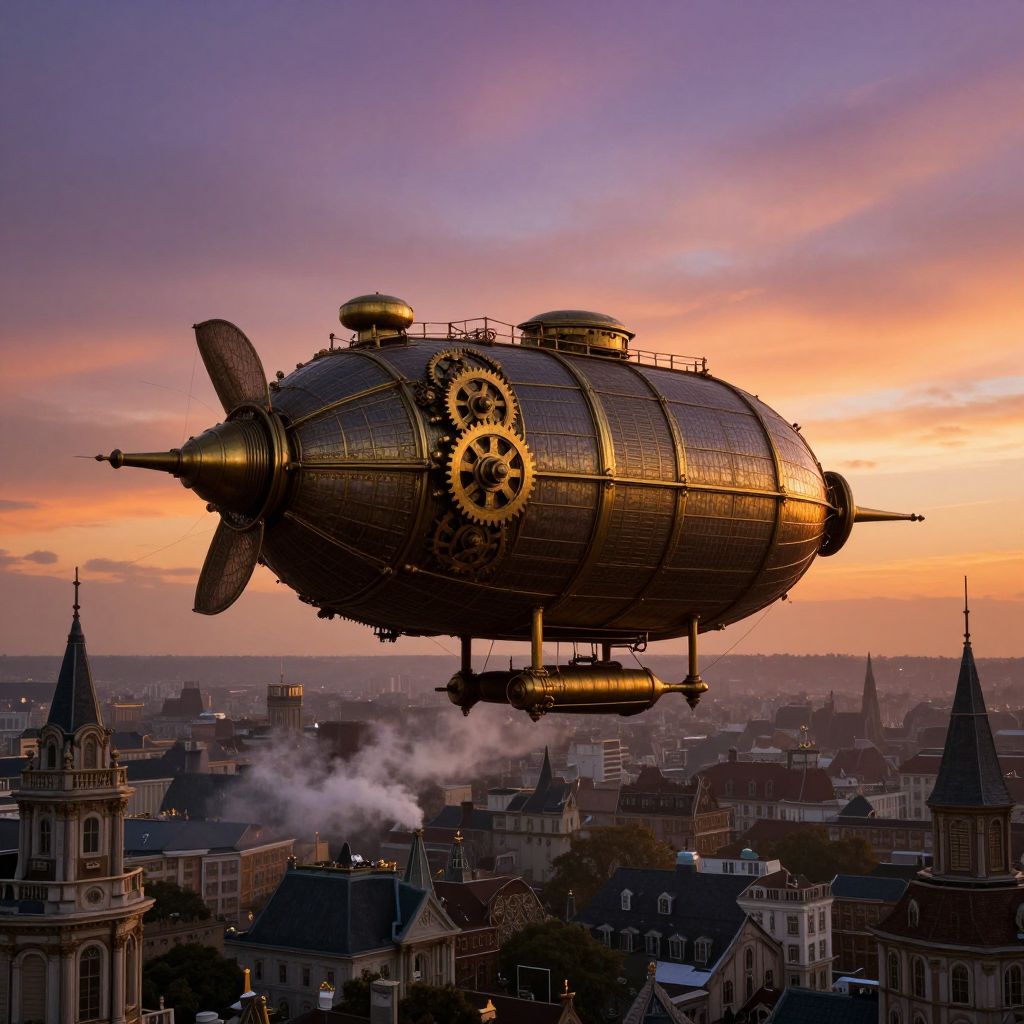 Toght, elegant steampunk airship soaring above a sprawling Victorian cityscape, billowing smoke and intricate brass gears, sunset sky painted with warm oranges and purples, detailed architecture and atmospheric perspective