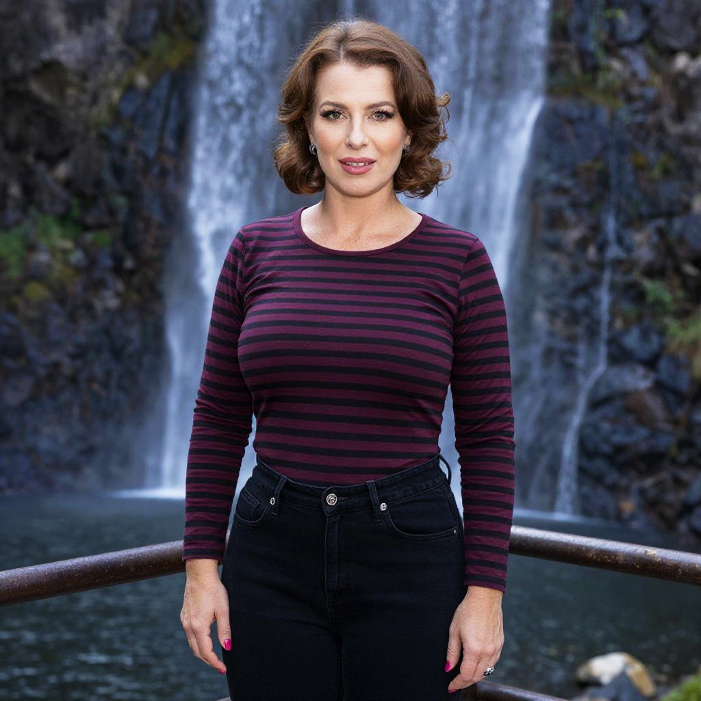 Photograph of a woman standing in front of a waterfall. She has short, wavy brown hair, fair skin, and is wearing a long-sleeved, dark purple and black striped top, paired with black high-waisted jeans. She has red lipstick and is looking directly at the camera with a slight smile. The background features a cascading waterfall with dark, rocky cliffs and green moss, creating a natural, serene setting. A metal railing is positioned in front of her, slightly to the left. The image is brightly lit, highlighting her and the waterfall.