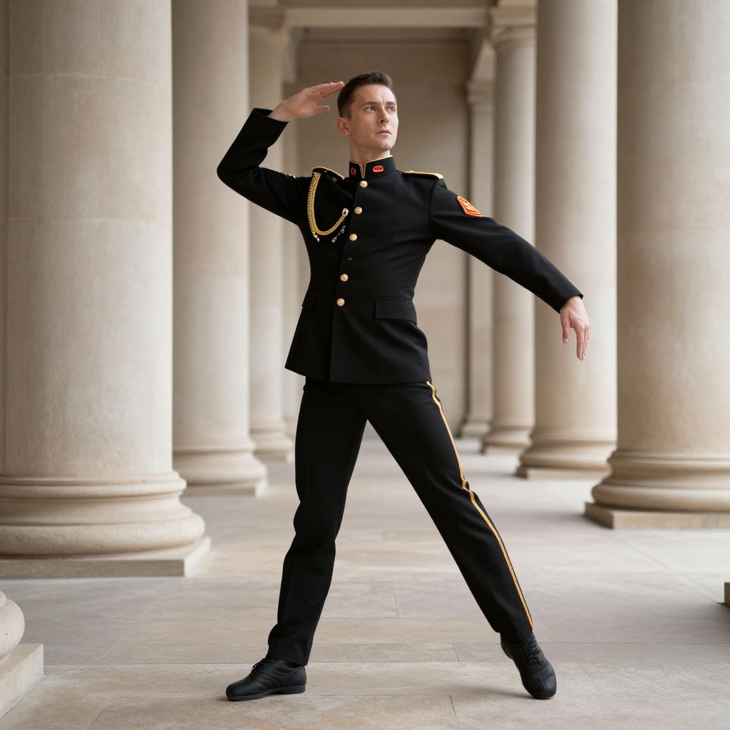 Soldier Dance Costume, man in uniform standing in a building with columns