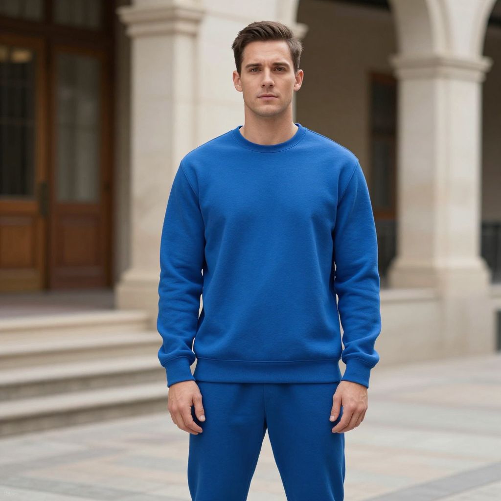 Photograph of a young Caucasian man with short, dark brown hair standing outdoors in front of a classical building with stone columns and wooden doors. He wears a bright blue, long-sleeved sweatshirt and matching blue pants, creating a bold, cohesive look. His expression is neutral, and he stands with his arms relaxed at his sides. The background features a stone-paved courtyard with steps leading up to the building. The image has a sharp focus on the man, with the background slightly blurred. The lighting is natural, highlighting the vivid blue of his clothing.