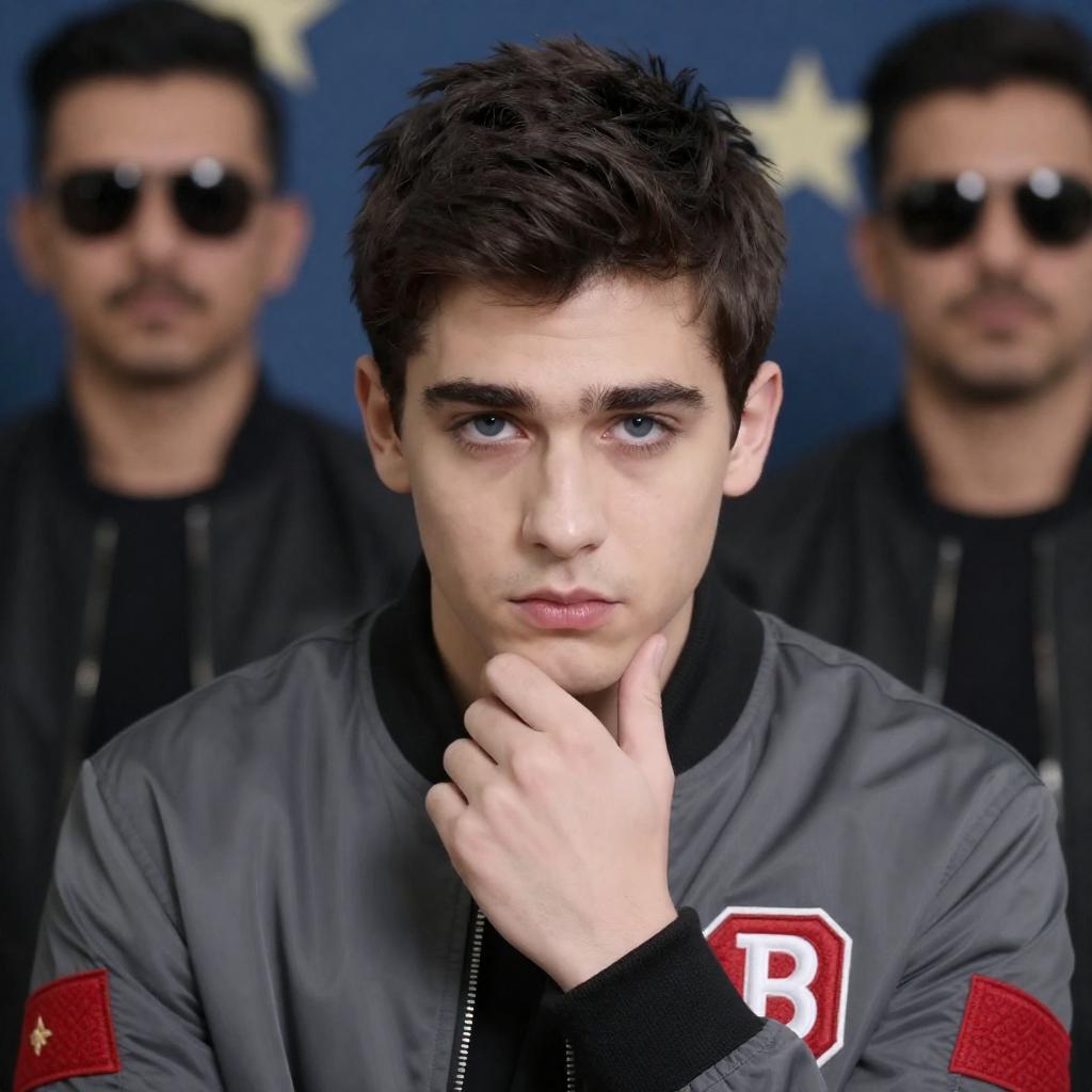 Photograph of a young man with dark hair, blue eyes, and a determined expression, resting his chin on his hand. He wears a gray jacket with red patches. Background: two men with sunglasses and mustaches, blurred. Stars on blue background.