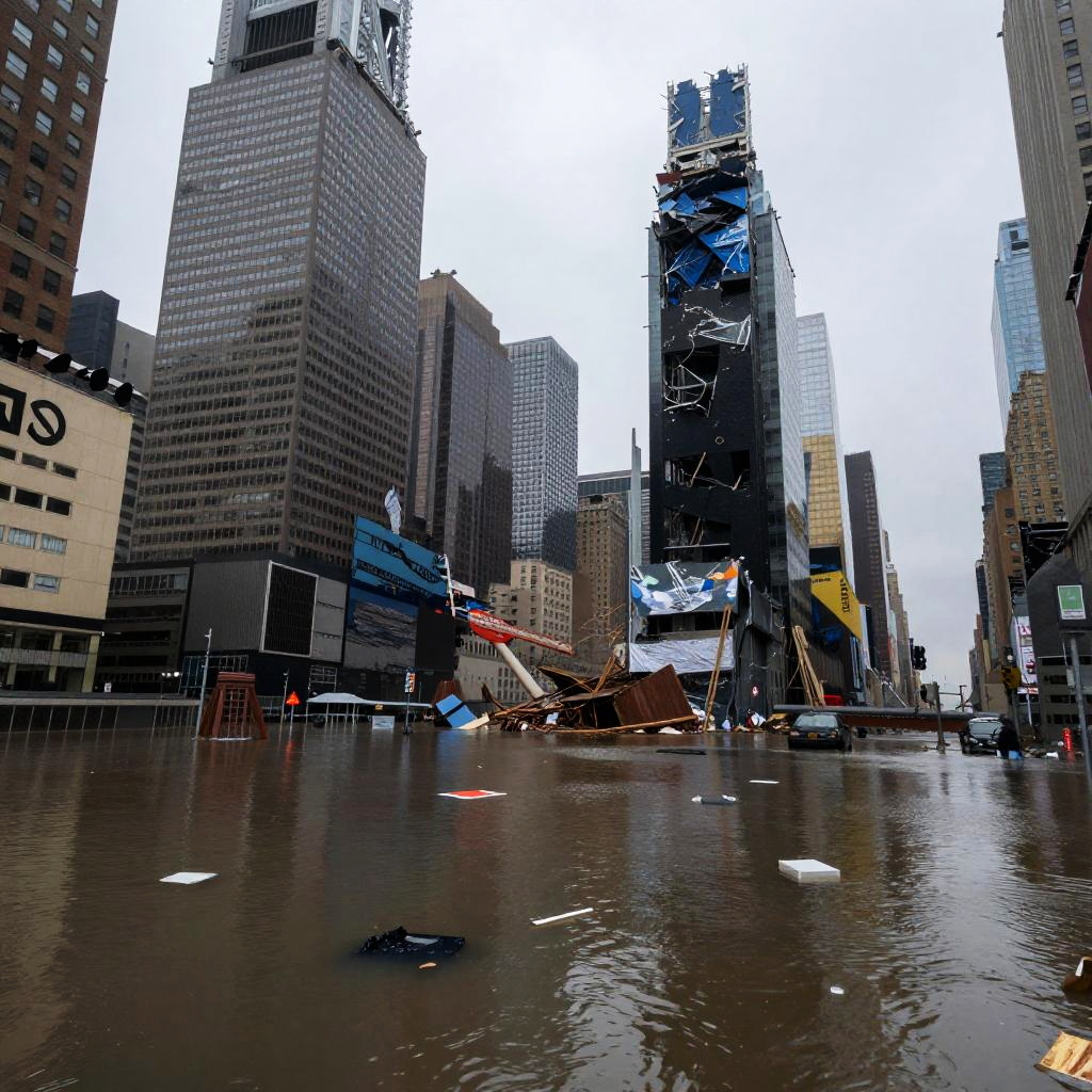 Tsunami NYC aftermath, flooded Times Square with abandoned skyscrapers, debris floating in water, eerie calm after the storm, grey overcast sky, photo-realism with fine details, urban destruction and resilience theme