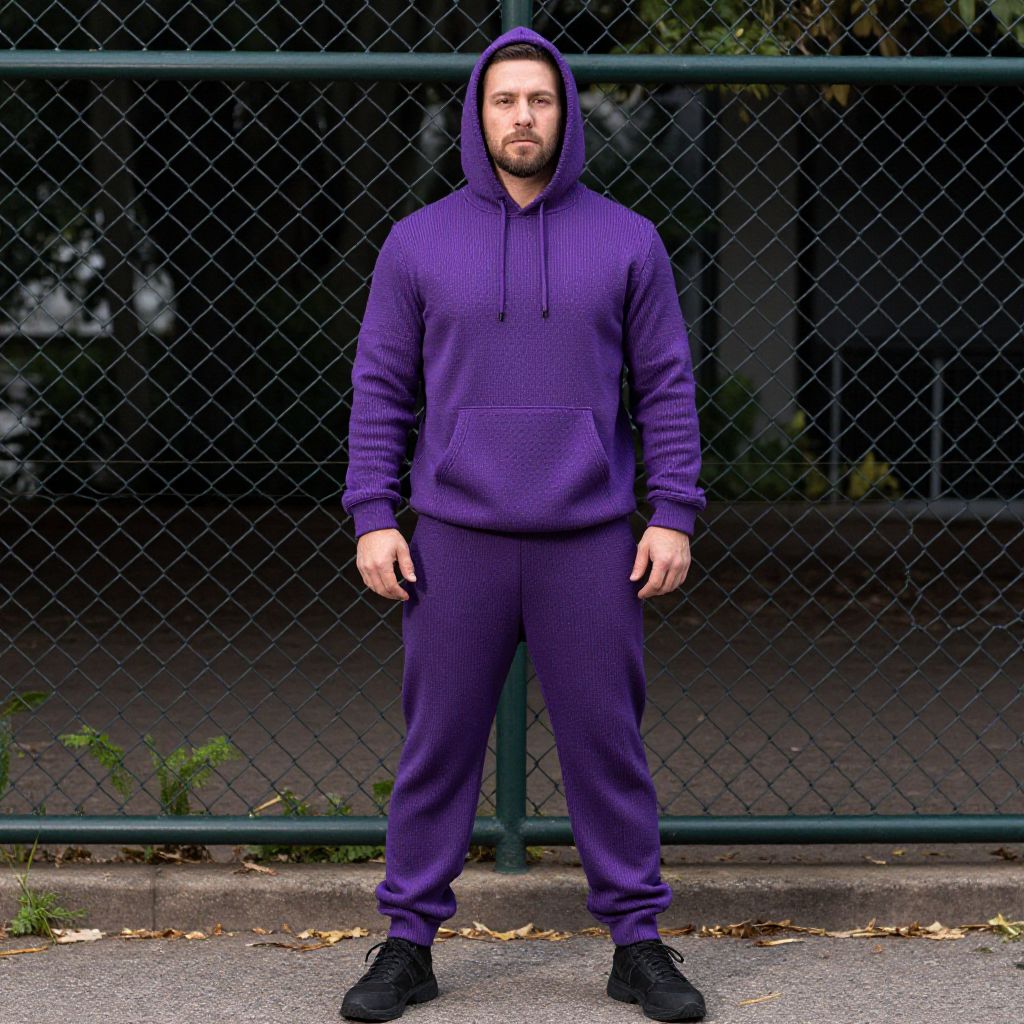 Photograph of a bearded man standing in front of a chain-link fence. He is wearing a purple hoodie with the hood up, matching purple pants, and black sneakers. The hoodie has a textured fabric, and the pants appear slightly loose. The background shows a dark, shadowy area with some greenery and ground leaves visible at the bottom. The fence's green metal frame contrasts with the purple clothing. The man has a neutral expression, and the overall scene has a slightly moody, urban atmosphere. The lighting is natural, highlighting the purple hues of his outfit.