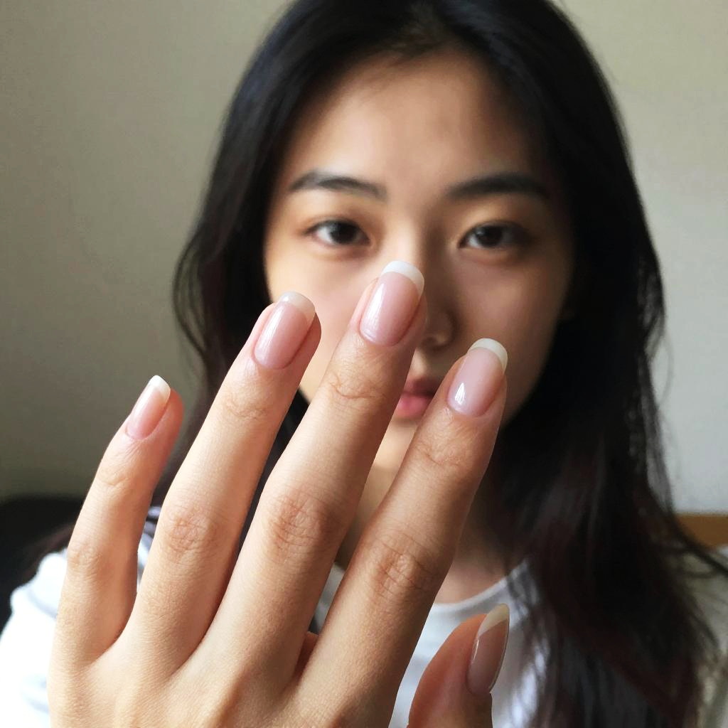 Photograph of an Asian woman with long, straight black hair, partially blurred in the background, focusing on her hand in the foreground. She has smooth, light brown skin and is holding up her right hand with neatly manicured nails featuring a French tip style. Her fingers are slightly spread apart, and her nails are glossy and well-maintained. She is wearing a white top, and the background is out of focus, showing a plain, light-colored wall. The image has a soft, natural light, highlighting the texture of her skin and the shine on her nails.