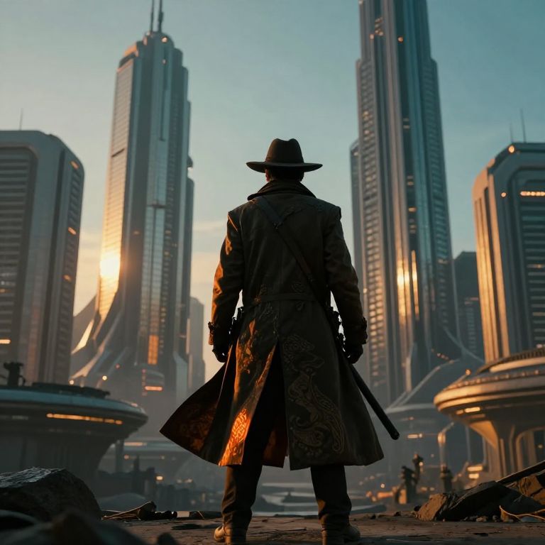 In this captivating sci-fi scene, a gunslinger stands resolutely in the foreground, his back to the viewer, exuding an air of mystery and readiness. His long coat, adorned with intricate patterns, billows slightly in the breeze, revealing a glowing orange light that contrasts with the cool tones of his surroundings. The gunslinger's hat casts a shadow over his face, adding to the enigmatic aura. The cityscape behind him is a marvel of futuristic architecture, with towering buildings that reach towards the sky, their surfaces reflecting the warm, golden light of the setting sun. The interplay of light and shadow creates a dramatic effect, highlighting the textures and details of the buildings and the gunslinger's attire. The overall composition is balanced, with the gunslinger positioned centrally, drawing the viewer's eye towards the heart of the scene. The professional lighting and cinematic feel of the image enhance the sense of depth and scale, making the viewer feel as though they are standing in the midst of this otherworldly landscape.