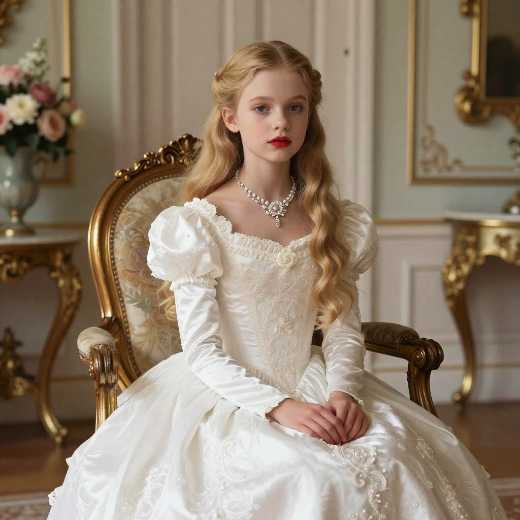 Photograph of a young Caucasian girl with light brown, wavy hair, wearing a lavender, Victorian-style ball gown with puffed sleeves and intricate gold embroidery. She has fair skin and red lipstick, and wears a matching choker necklace with a large purple gem. She stands in a grand, opulent room with white walls, gold-trimmed panels, and a polished wooden floor. A gold console table with a bouquet of pink, white, and green flowers is on the left, and an ornate gold-framed mirror is on the right. She wears silver ballet flats. The lighting is soft, highlighting the elegance of the scene.