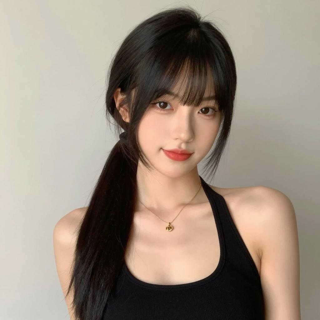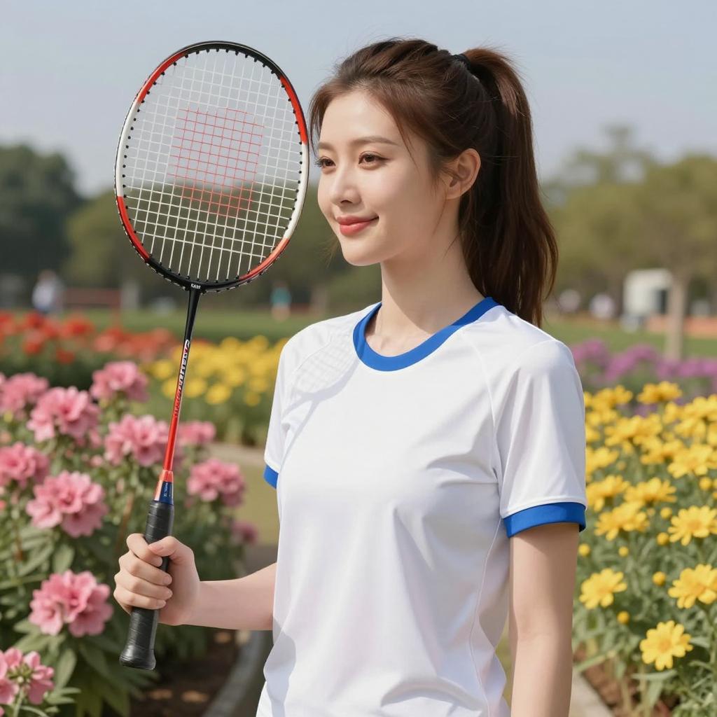 Badminton outfit, photograph of an attractive young Asian woman, standing in a sunny garden, wearing a black athletic tank top with pink trim and black athletic shorts with white waistband, long brown hair, red lipstick, green eyes, slight smile, medium breast size, slim build, vibrant green foliage and pink flowers in the background, bright sunlight, natural light, daytime, summer, casual outdoor setting
