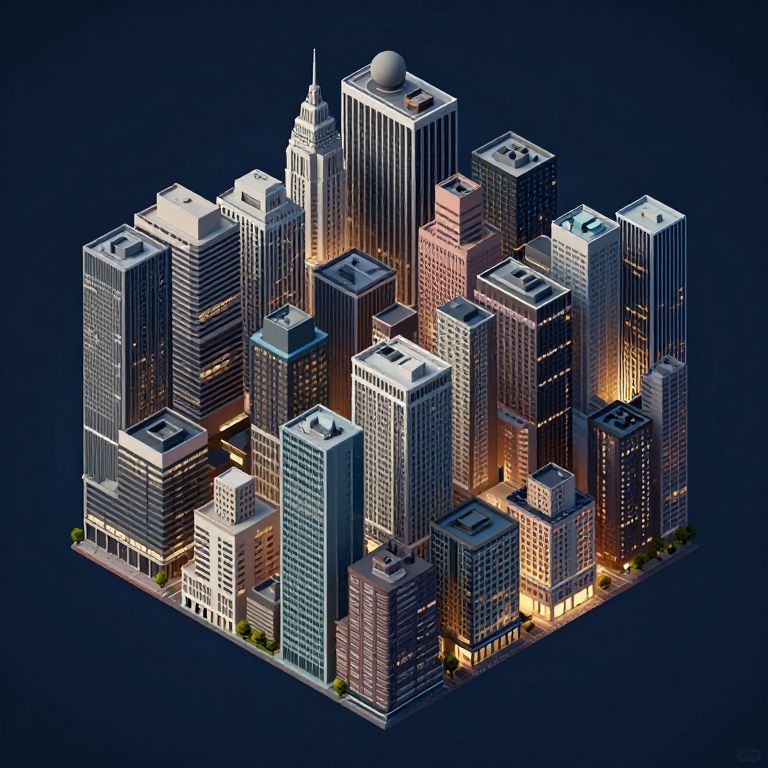 Digital illustration of a brightly lit, 3D isometric cityscape featuring densely packed, colorful skyscrapers with illuminated windows, set against a dark