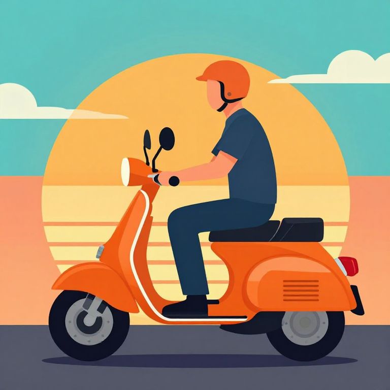 A vibrant retro-style vector illustration depicts a person riding a classic orange scooter against a sunset backdrop, featuring bold colors, clean lines, and a nostalgic aesthetic reminiscent of mid-century design.