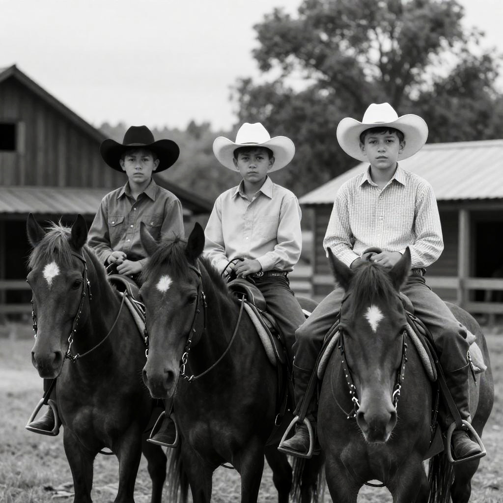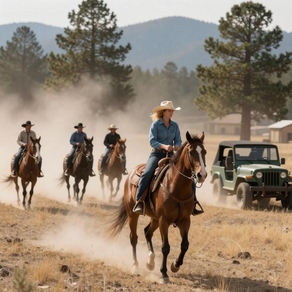 Photograph of a Western scene with six cowboys on rearing horses, charging towards a group of people standing near a wooden structure. Cowgirls wear white hats and dark clothing. Dust rises, trees in background. Intense expressions.